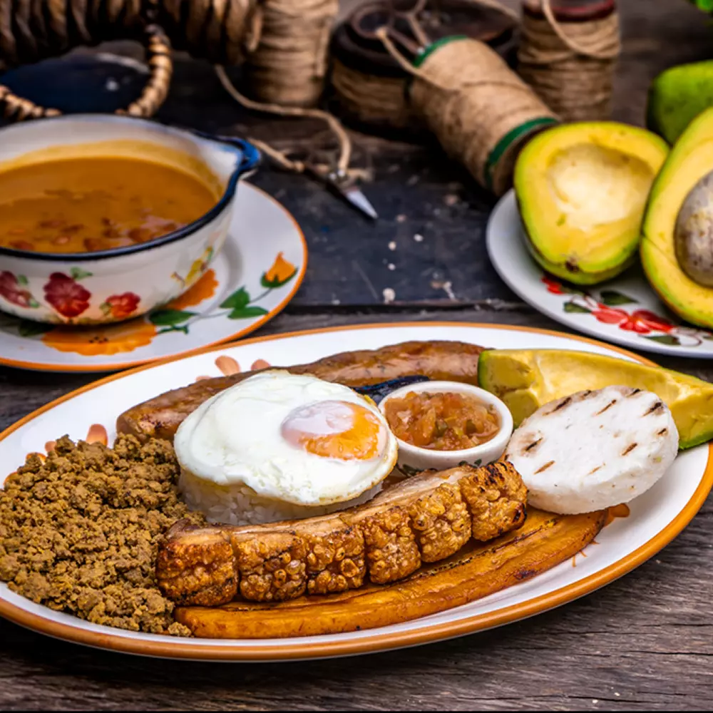 Frijoles montañeros, tocino al cajón, carne en polvo, chorizo, morcilla, arroz blanco, tajada de maduro, huevo en cacerola, arepa y aguacate.