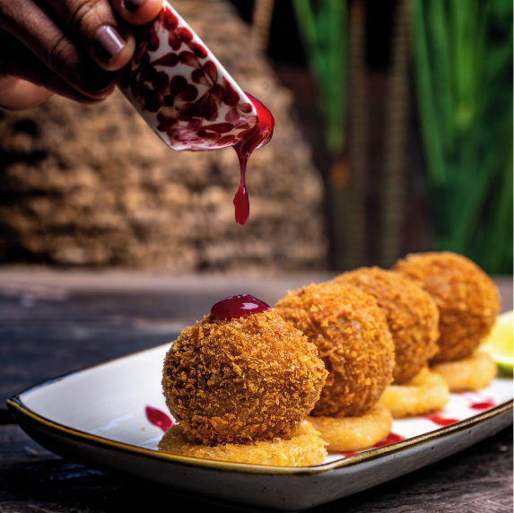 Queso butifarra acompañado de mix de rugulas de tomates cherry caramelizados al estilo matriarca.