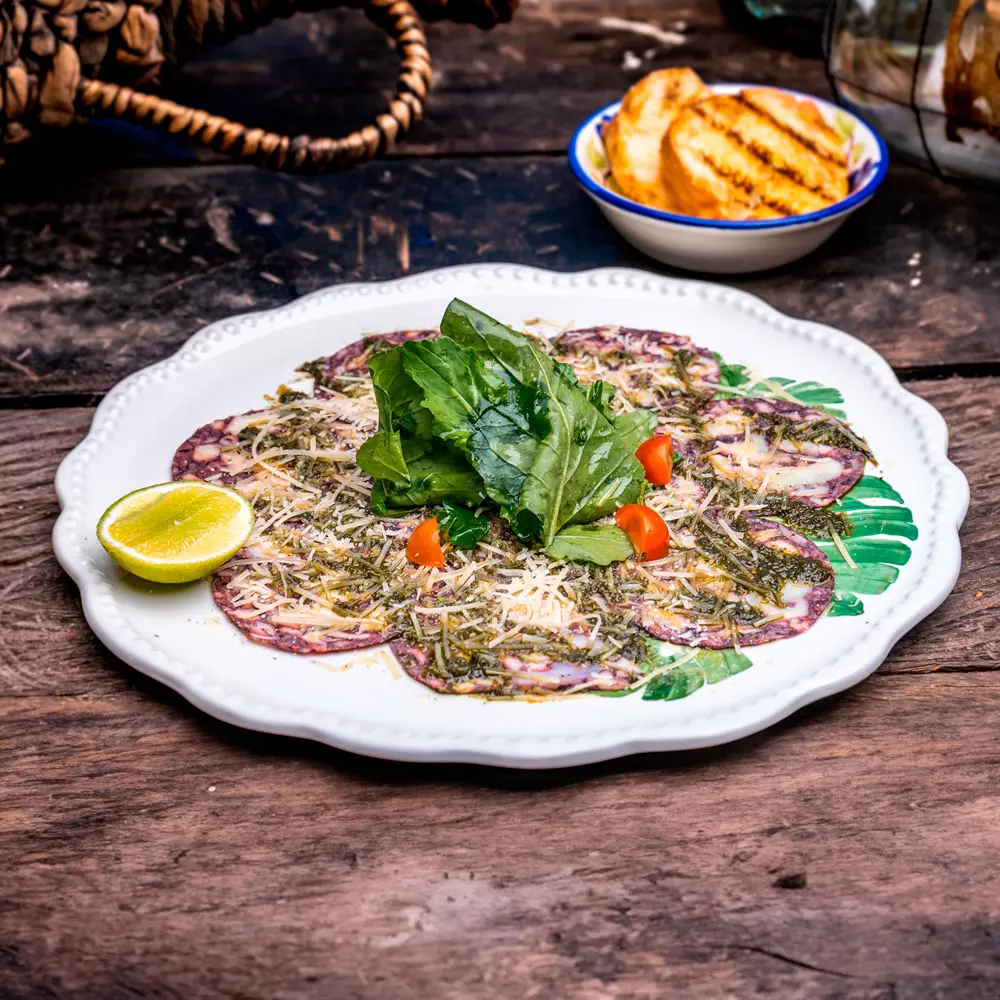 Finas láminas de pulpo curado con pimienta, macerado con reducción de salsa pesto, alcaparras, queso parmesano, limón sal del Himalaya y pimienta.
