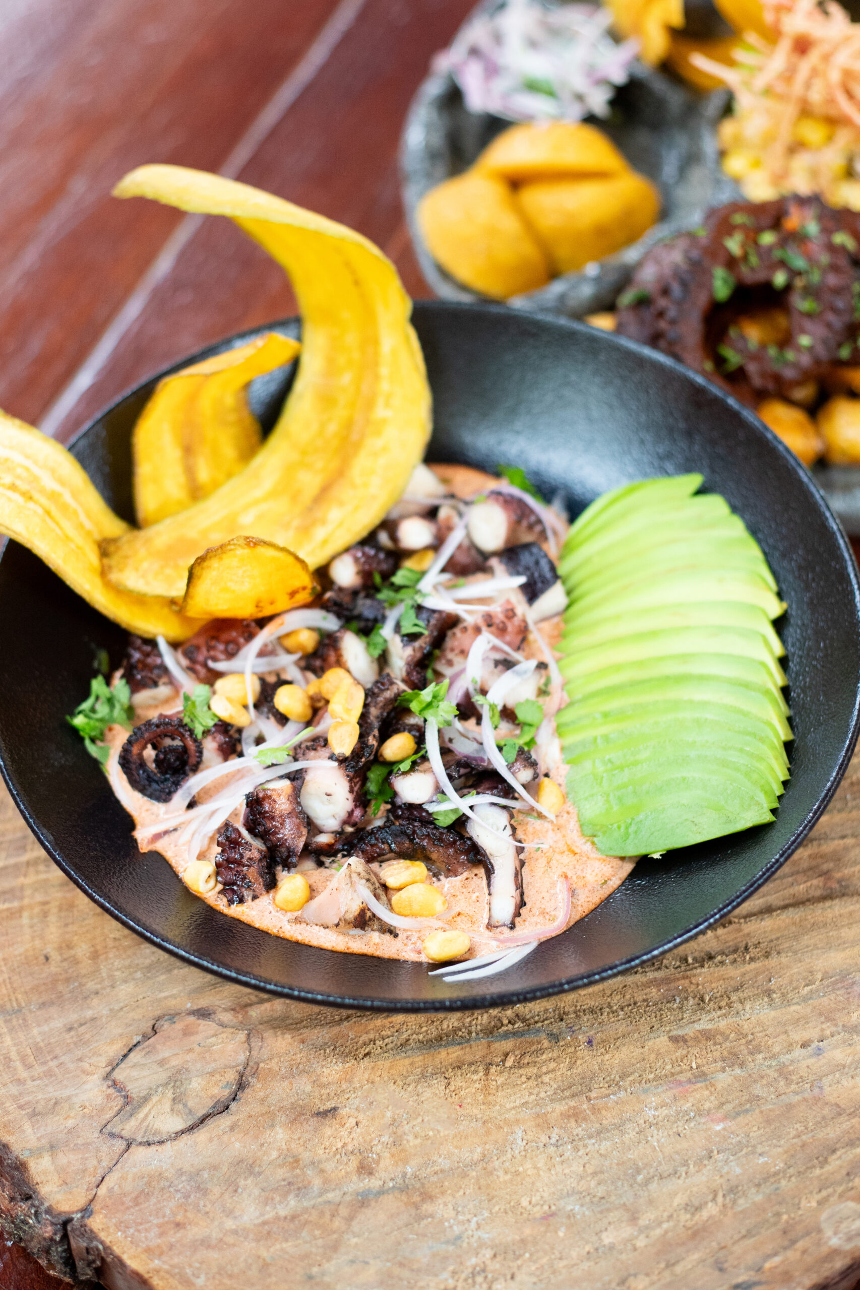 Pulpo a la parrilla, zumo de limón, mayonesa especial, cebolla, cilantro y ají panca.
