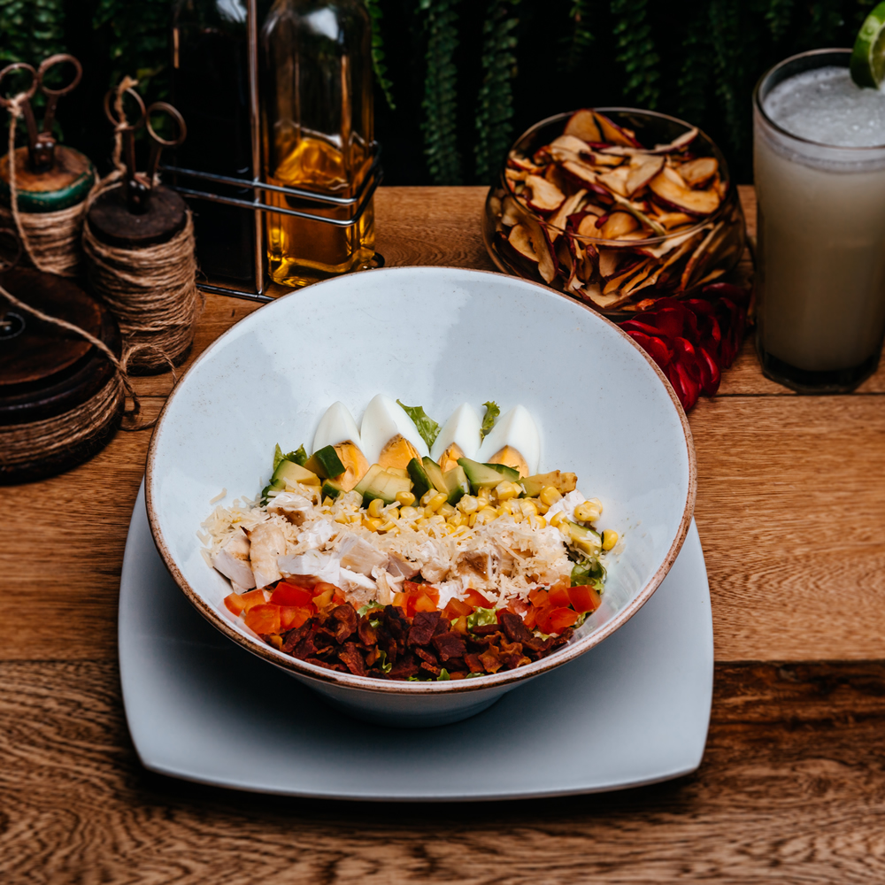 Esta es la ensalada que más les gusta a mis nietos: pollo en julianas, cama de lechugas, aguacate, parmesano rallado, huevo cocido, maíz tierno, tomate, crocante de tocineta y aderezo ranch.