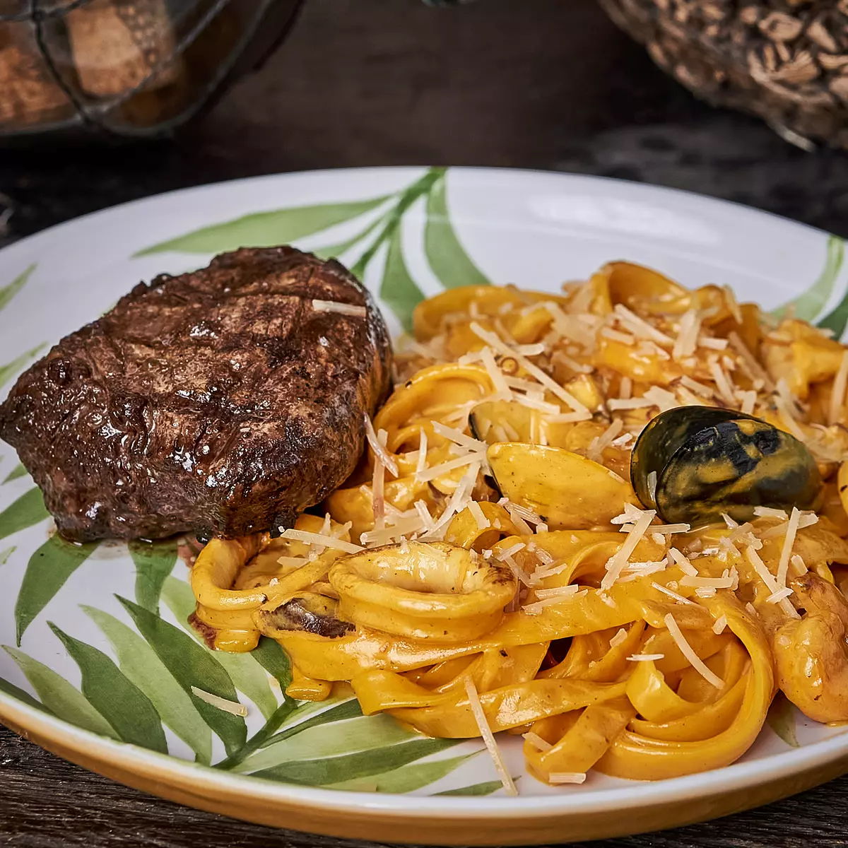 Pastas fetuccine con camarón, calamar, pulpo y mejillones negros en una salsa cremosa huancaina con ají amarillo servido con una porción de lomo fino a la parrilla.