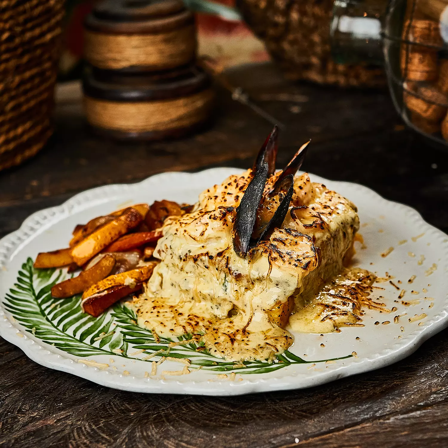 Salsa cremosa con camarones, aros de calamar y mejillones negros.