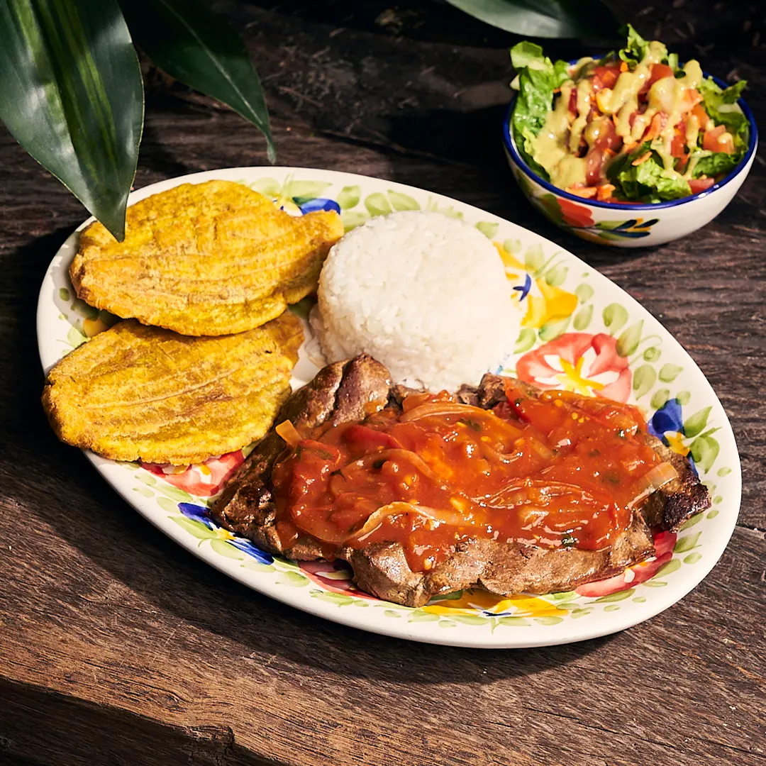 HIGADO A LA PARRILLA CON SALSA A LA CRIOLLA, ARROZ BLANCO, PATACONES Y ENSALADA DE LA CASA
