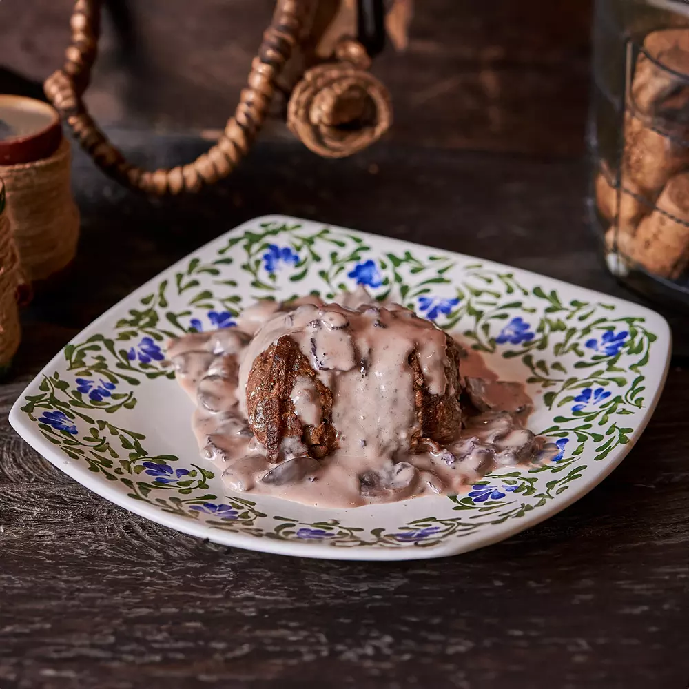 Corte de lomo fimo asado a la parrilla y bañado en salsa demiglas a base de tocineta y notas champiñones.