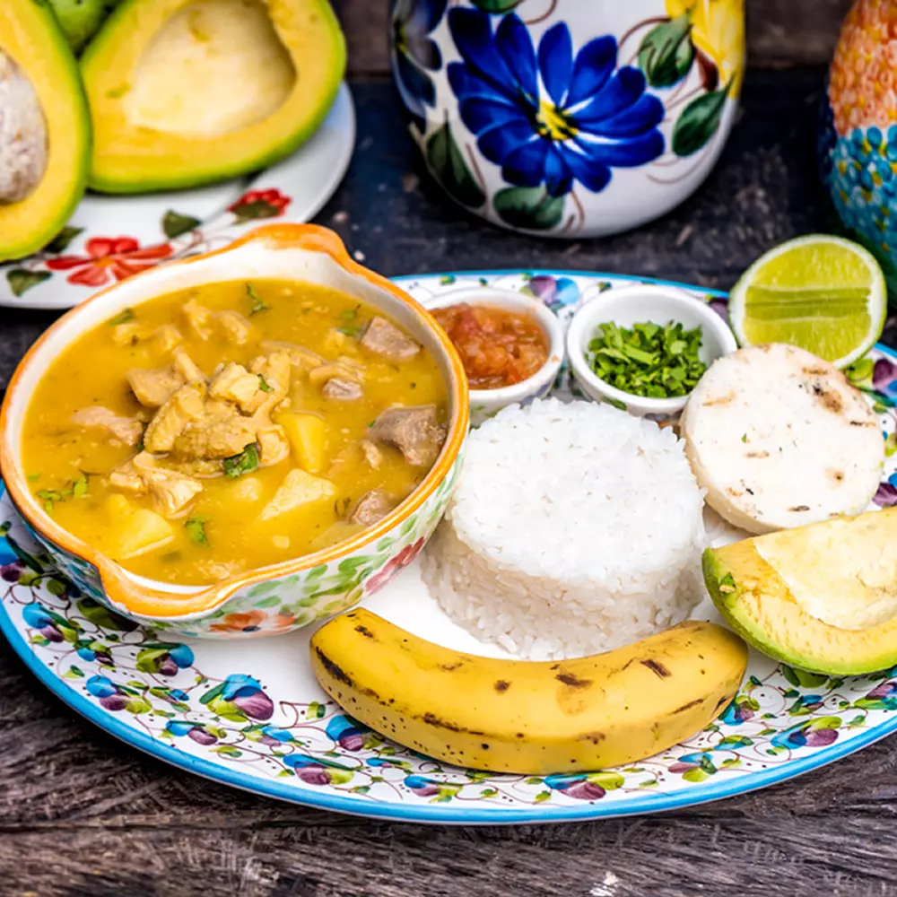 Arroz blanco, aguacate, banano, arepa, hogao y cilantro.