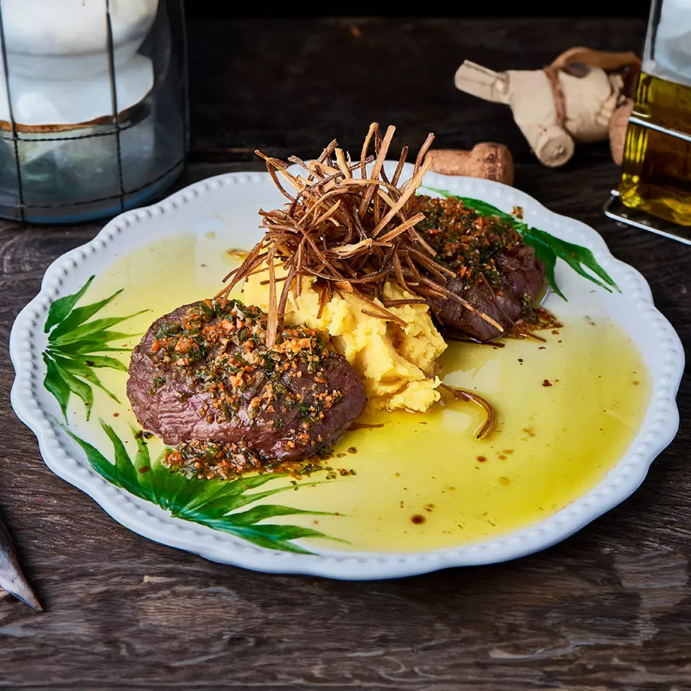 Dos medallones de solomito sobre una cama de puré de papa capira bañados con chimichurri especial de la casa.
