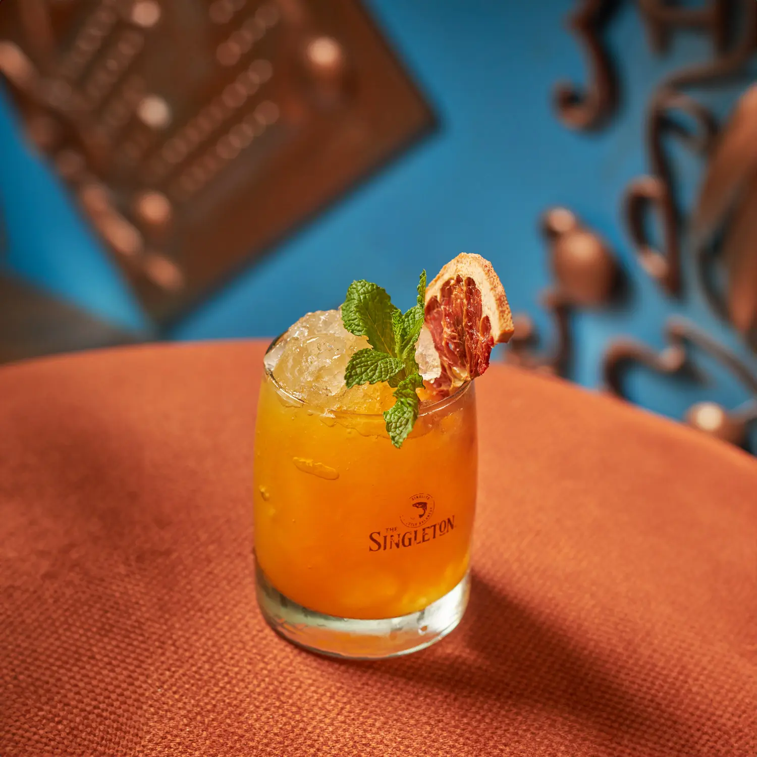 Ron blanco, maracuyá en hierbas , licor de banano, ron Malibú y zumo de limón.